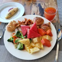 레스토랑에서는 일몰을 바라보는 멋진 해변이 내려다보였으며 레스토랑에는 서양식과 발리식 음식이 모두 다양하게 준비되어 있었고 해산물 선택도 훌륭했습니다. 참치 스테이크를 먹었는데, 아름답게 요리되어 너무 맛있고 잘 표현되었습니다.