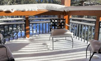 In the unit, the fully furnished kitchen opens to the dining area and a cozy living room. Step outside onto the private deck to enjoy the fresh mountain air, sit by the fire to read a book, play one of the board games, or enjoy the huge 65" TV for streaming content or browsing through channels.
