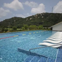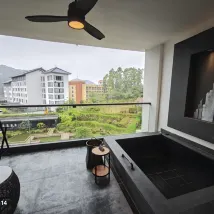 호텔은 마오밍 고속철도역에서 차로 약 1시간 거리에 있습니다. 우리는 호텔의 고속철도역 픽업 서비스를 이용해 교통비를 절약했습니다. 프런트 데스크에서 우리 방을 전용 온천 수영장이 있는 방으로 업그레이드해 주었지만, 온천 수영장이 발코니에 있었고 커튼이 없어서 방에서 온천을 즐기려면 여전히 수영복을 입어야 했습니다.
