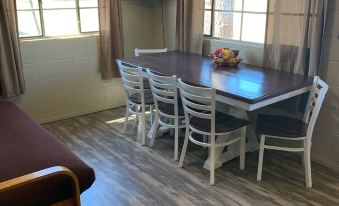 The livingroom/dining area contains a full-size futon, 32" Smart TV, table and seating for 6. There is also a picnic table in front of the cabin.