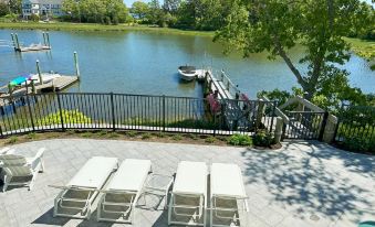 This private waterfront home can host up to twelve and consists of five bedrooms (three king beds, six twin beds), with water views. In addition, the home boasts two kitchen areas, two living areas, three full bathrooms, and private decks with outdoor seating. Enjoy the peaceful private setting on the decks overlooking the pool and water, swim in the heated seasonal pool, kayak in the bay or to the beach (two kayaks provided), or simply enjoy a good book on the private dock overlooking the water.