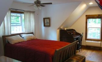 The eco-friendly cottage, constructed in 2013 by contractor Steve Storm, mixes contemporary design and amenities with antique furnishings and Americana charm. Every inch of the 700 square feet is efficiently utilized with nothing wasted. Soudan Cottage was sited and designed with sustainability and a simpler, more relaxed existence in mind. Solar panels cover the southern roof line and store energy in hand made battery lockers. Ceramic tile floors throughout the downstairs kitchen, bath, and sitting area provide natural cooling in warm weather. Pine flooring in the upstairs bedroom/study offers comfort year round. Mr. Slim climate units can be run during the day - but may drain the batteries overnight if overused. A backup generator can provide power if the sun is insufficient. the cottage was situated to take advantage of prevailing summer breezes aided minimally by small fans. Cool night air can be circulated through the cottage's 13 windows via the upstairs ceiling fan.