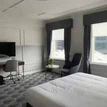 호텔은 총 5층입니다. 베이지색 건물에 검은색 간판이 조화를 이루어 레트로한 분위기를 자아냅니다. 1층 라운지 공간은 꽤 넓고 그랜드 피아노도 있습니다. 제가 예약한 킹사이즈 침대는 크지는 않지만 따뜻하고 편안했습니다. 다만 책상에 불이 들어오지 않아 TV 벽 뒤의 불빛 때문에 약간 어둡게 느껴집니다. 방음은 꽤 잘 되어 있습니다. 욕실은 밝고 샤워기 수압도 아주 좋습니다.