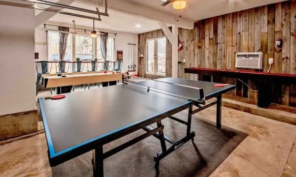 GAME ROOM The game room is a true highlight, with glass windows offering breathtaking lake views. This space is designed for fun and entertainment, featuring an air hockey table, shuffleboard, and a ping pong table. For some outdoor adventure, you'll also find fishing poles, marshmallow sticks for roasting, and a large selection of board games. Whether you’re looking to compete, relax, or make family memories, this room has something for everyone.