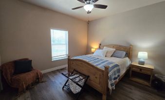 The split floor plan creates privacy for the primary bedroom with large en suite bathroom. The additional three bedrooms are tucked quietly on the west side of the home. All bedrooms have queen beds. The three bedrooms on the west side of the home share a large bathroom with double sink. A half bath is located off the kitchen.