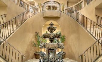 A movie theater accommodates about a dozen and features sumptuous recliners, huge screen, popcorn maker and surround-sound system. Two cozy nooks are created within the barriers of the staircases and feature fountains and seating.