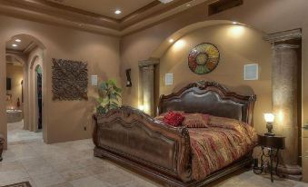 This house was built for fun and to share joyous times with family and friends. The incredible designed "follows" the sun throughout the day and yet the sun never touches a wall of the home itself - never gets hot inside. 60 foot ceiling - not a type-o :) - 6 staircases including spiral next to the full and then some outdoor kitchen (8 burners plus griddle/Benihana style cooking) to the observation/sun/dinner deck on the roof. Its massive & has gorgeous 360 degree forever city and mountain views including Superstition Mountains which stare us in the face. There's boating with a marina bar and grill 10mins away in Usery Park. Expansive master (1500+ sqft) with a sitting room and his/hers bathrooms and showers and huge Jacuzzi tub. Theater room has 14 leather recliners and additional giant 6-7' foam love sac type things of ultra comfort, Huge commercial kitchen designed for catering, Game room with pool table and bar. Beautiful travertine & granite throughout, 60 foot + atrium ceiling with 8' fountain and and dual curved staircases on each side. A dozen fountains, an indoor/outdoor grotto and breakfast patio, and a stairway ascending from the downstairs living area to the pool. The home is 6565 sqft inside with 3200 sqft of patio outside, full outdoor 8 burner kitchen. The luxury, beauty, and unique character of this home can't be matched. We're open to vacation rentals and longer term or corporate rentals.