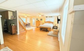 Downstairs- Finished basement with a kitchenette. 1 bedroom with 2 sets of bunk beds, living area with a king bed and twin sized day bed. Two three seasoned porch, one with a queen sized bed. The other with a twin daybed with trundleAbout pets:No pets allowed.About checkOut:Check out before 10:00 AM.About children:Children allowed: ages 0-17.About checkIn:Check in after 3:00 PM.About smoking:Smoking is not permitted.About minBookingAge:Minimum age to rent: 18.About events:No events allowed.