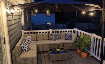 Prefer to be outside? Cook up some BBQ on one of our grills. Enjoy a day of lounging on our deck under the sunshade or a night under the party lights. We've even got you covered with an infrared heater and some blankets if it's a little chilly. Don't forget to have some fun sitting in the Adirondack chairs around the fire pit any time of year. We've got skewers for making s'mores or cooking some hot dogs and brats over the open flames.
