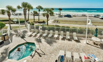 Majestic Sun offers a heated indoor pool which connects and spills down to the adjoining outside pool. Two steaming hot tubs are located outside on either side of the pool. Multiple chairs are provided for lounging in the sun. All is enclosed by a fence to provide security for guests utilizing amenities of majestic Sun. There is also a full fitness center on site that overlooks the beautiful white Gulf beaches.