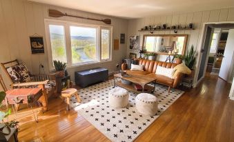 Please note, the Lodge shares a driveway with our other rentals—the Cabin and the Cedar. The Cedar, in particular, is located a few yards away from the Lodge, but efforts have been made to include privacy for both. Because we have multiple units within close proximity to each other on the property, we ask that guests respect quiet hours after 10pm. Some of the grounds, and the Lounge area (with the killer view!) located across from the Lodge are shared, common spaces with other guests.