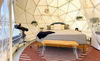 The Moonlight Dome (king bed) is located just outside the Lodge, and up a flight of stairs. Kick back and relax on the private rooftop deck, and use the telescope to stargaze. The dome shares the second full bathroom inside the Lodge. The dome is air conditioned (with blackout curtains!) during the warmer months. For the colder days, the dome has heat, and a heated mattress pad. Please note that the dome is not usable as a bedroom during the coldest months (Jan/Feb) due to the chill (insulation is limited inside the dome). As such, the nightly rate in January and February has been reduced to reflect 2 bedrooms and 2 baths available.