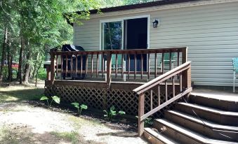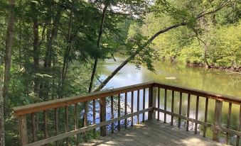 Beautiful home, very clean, comfortable furniture in living room with patio doors to deck. Large bathroom with comfy towels off of main bedroom with patio doors to deck. We only used main bedroom, but other 2 bedrooms and bath were very nice. Great kitchen, well stocked with dishes. microwave and full-size appliances. Nice large deck, table/chairs off living room, with fire pit bellow. Cute deck over river, we watched kayakers and tube floaters going down river. Wish we could have stayed longer, very peaceful retreat.