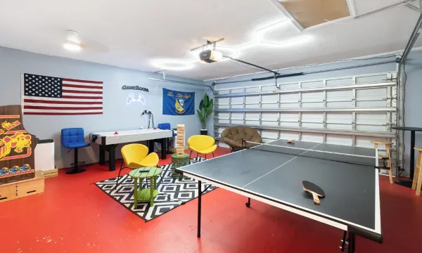 The garage has been transformed into a climate-controlled Game Room — complete with: