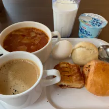 무료 조식이라 기대 안했는데, 빵이랑 요거트, 수프 등이 제공되어 아무 만족스러웠어요.