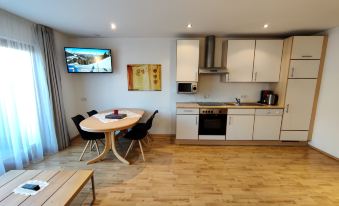 The self-catering apartments in Alpine style come with a balcony with mountain views, wooden floors, and a living area with a fully equipped kitchenette. Linen and towels are included.