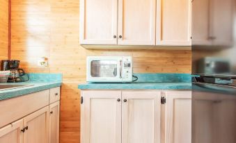 The Tiki Hut is a studio located on the 2nd floor, accessible via the outside spiral staircase. It features a private entrance and a spacious master bedroom with an en-suite bathroom. The kitchenette features a fridge, coffee maker, microwave, hot plates, sink, and air fryer.