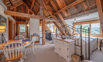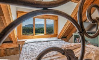 Our authentic post and beam with an open concept, provides panoramic views of the surrounding peaks and trails. Our kitchen / dining area / and living room accentuate the majestic mountain views through our 14 windows spanning from the ceiling to the floor! Everyone can share their stories from a great day of adventures, from the kitchen dining table or around the fireplace.