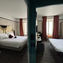 방이 정말 좋았습니다. 네 가족이 머물기에 매우 넓었고, 저희가 쓴 방이 가장 큰 방이었던 것 같아요. 운 좋게 트라이애슬론 대회가 열려서 구경하는 행운도 누렸습니다. Ville 기차역에서 걸어서 700미터 거리였습니다. 방에는 환영 음료와 다과, 얼음물, 천 가방 등 모두 무료로 제공되었고, 슬리퍼도 매우 편안했습니다. 엘리베이터는 조금 작았지만 튼튼했고, 계단을 이용할 필요가 없어서 아주 좋았습니다. 서비스도 정말 훌륭했고, 직원분들이 매우 친절하고 세심하게 대해주셨습니다.