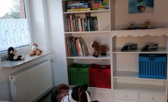 The bright, cheerful children's room with two single beds is equipped with games, books and stuffed animals.