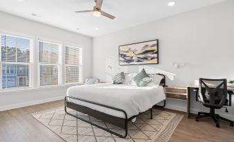 The spacious Living Room seats plenty on the large, sectional couch. There is no shortage of modern furnishings and touches in our Townhome. The Smart TV is set up with Cable and Streaming Services aplenty. Natural light fills the room from the back and leaves a warm, homey feeling.