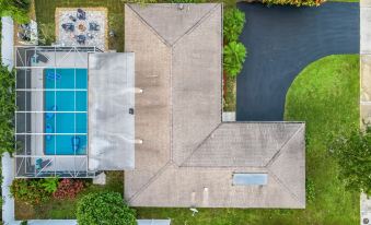 Resort-style amenities await with a massive covered saltwater heated pool, high-end grill, smokeless fire pit, and plenty of seating. Lounge poolside under the tranquil breezeway, enjoy games of cornhole, or relax in Adirondack chairs by the firepit. The screened-in patio area offers additional seating and dining spaces. The pool can be heated during cooler months upon request (additional fee may apply).