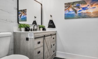 Relax in three king-bedroom suites with premium bedding and coastal touches. The Palm Master suite includes a spa-like bathroom with a soaker tub and rainfall shower. The Lighthouse and Wave guest rooms continue the beach theme and share a second full bathroom. Additional guests can use the queen sleeper sofas in the living and family rooms.