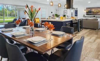 The gourmet kitchen features a massive granite island with seating for four, smart stainless steel appliances, a coffee station, and a beverage fridge. Dine at the table for eight under modern lighting or enjoy alfresco meals by the pool.