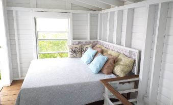 Sea Shanty, which sits in 1/4 acre of private grounds, has a roof top deck, overlooking the trees, with a view to the ocean beyond. There is a new 15 foot, private swimming pool for your use. The cozy master bedroom, which has King size bed, is directly off the deck on the second floor of the house. Downstairs is open plan, with the a small, but fully functioning kitchen, a dining area suitable for 4, and a lounge which has a TV and a couch. Off the living room, there is a small 2nd bedroom with a queen bed, and a single loft bed above. This second bedroom would suit children, but also works for a couple. The property is quiet and peaceful, with only few high end houses in the neighborhood.