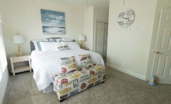 The home features three bedrooms - the first floor master bedroom with king bed and attached bath, and two additional bedrooms and another full bath on the second floor.