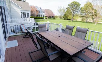 The screened in patio and open back deck are ready for you to sit and enjoy the morning sunrise or your evening cookout while taking in stunning views of the golf course. (New patio furniture arriving for the 2025 season!) The shared backyard is a perfect spot for the kids to play!