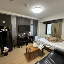 심플하고 저렴한 호텔입니다. 체크인은 2층 프런트 데스크에서 하실 수 있습니다. 정수기, 동전 주입식 탄산음료수, 화장실이 있습니다. 수건 교체는 프런트 데스크에 문의하세요. 금연 세미더블 스위트룸입니다. 객실 편의시설은 다소 오래되어 보이며, 전반적인 청결도는 개선이 필요합니다. 객실은 넓지는 않지만 29인치와 20인치 캐리어를 모두 넣을 수 있습니다. 객실에 전자레인지가 있어서 아침 식사와 야식을 데우기 편리합니다. 호텔은 오카야마역에서 도보로 약 8분 거리에 있습니다. 근처 상점가는 식사와 쇼핑을 즐기기에 편리합니다. 직원들은 대부분 외국인이지만 서비스는 훌륭합니다. 👍 강력 추천합니다. 👍👍👍
