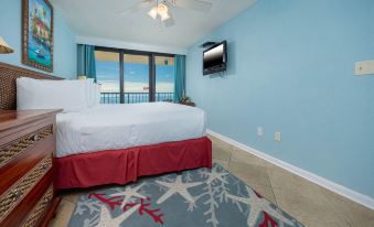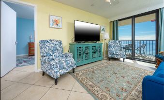 As you explore the condo, you'll notice the elegant tile floors throughout, adding a touch of charm to the interior. The decor is inspired by the coastal hues, creating a serene and inviting atmosphere. The open and airy layout is perfect for relaxation and entertainment. The living area boasts a comfortable queen sleeper sofa, inviting you to unwind while taking in the panoramic views.