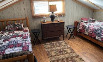 The cabin has 2 bedrooms with queen beds on the 1st floor as well as a bathroom w/jacuzzi tub. There’s a bedroom w/2 twins beds upstairs along with a bathroom and a loft area that houses another queen bed.