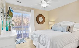 All bedrooms are located on the lower level of the home. The first bedroom features a queen-sized bed, nightstand, dresser, flat screen TV, and sliding glass doors opening to the second balcony.