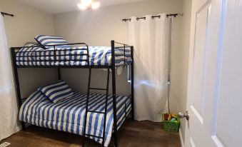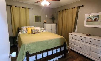 Two bedrooms, one bathroom, and a double sofa bed (5’ long) can accommodate up to 6 guests. (Note, wide-angle lens makes some rooms appear larger than they are.) The kitchen is well stocked to meet your cooking needs. Also, there is a grill available on the back porch, so you can attend to supper preparation while your children play happily on the playset and swings in the yard. There is air hockey, spikeball, a children’s bookshelf, lots of legos, puzzles, and other toys. We welcome families with children!