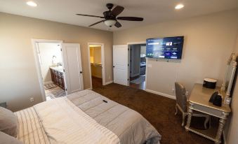 The Master bedroom contains a king size bed,a vanity table,a walk in closet,two night stands and a 65” smart tv.Master bathroom has double vanities and a walk-in shower.Toiletries are provided.