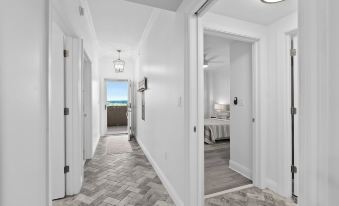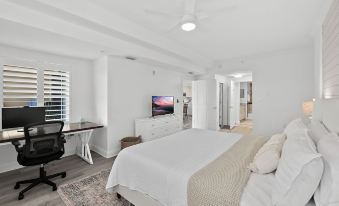 The space offers three bedrooms and two and a half bathrooms. Each bedroom is equipped with a smart TV, and Wi-Fi is available throughout the unit. The spacious primary bedroom features a king-sized bed with breathtaking Atlantic sunrise views, an oversized desk, a walk-in closet, a secondary closet, and a large en-suite bathroom—perfect for unpacking and settling in for long stays. The second bedroom includes a queen bed and a mirrored closet, while the third bedroom has two twin beds, making it ideal for weekend guests or visiting children.
