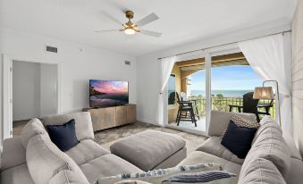 The airy, open-concept living space includes a fully equipped kitchen with pots and pans, a toaster, Keurig coffeemaker, blender, and all the essentials to make your family’s chef feel right at home. The dining table comfortably seats six, with four additional counter stools available. The large sectional sofa and smart TV create the perfect setting for enjoying movies and sports with family. The balcony offers a peaceful spot to start or end your day, with views of the Atlantic and the resort-style pool below.