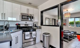 Welcome to Neon Oasis...Palm Spring's premier destination for artistic luxury. Neon Oasis is located on a quiet street just off of HWY 111 close to the Palm Springs Aerial Tramway. You will be just minutes away from all of the downtown Palm Springs attractions and Mid-Century design district. This unit features one private bedroom with a huge king Sealy mattress bedroom king size bed and on suite bathroom. In addition to that there is a queen sized pull out sofa bed in the living room and another full bathroom. Great for a couple so each one has a private bathroom! There is a fully stocked kitchen including a dishwasher.