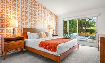 With its warm orange hues inspired by the desert sunsets, this primary bedroom gives you direct pool access and sunset views in the afternoon. Its wooden furniture and breeze block wallpaper bring the retro feel to the fore. This oversized bedroom with high vaulted ceiling features a luxuriously soft, hotel quality king-size bed, Brooklinen linens, its own private en-suite bathroom, large walk-in closet space, and generous dresser with large television. The primary en-suite bathroom is also mid-century in style with its white and wood twin vanities, retro lighting, and brightly tiled shower.