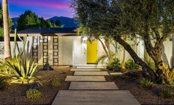 As you approach Panorama Palms, the bright yellow front door hints at the wonderfully vivid mid-century design you will find inside the home. Upon entering, the entrance foyer presents a totally groovy walnut room divider, the other side of which see the generous living room with high vaulted ceiling.