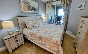 The Gulf front master bedroom boasts a king-size bed with views of the Gulf of Mexico and has its own private access to the patio balcony. Enjoy movies in bed on the room's flat-screen TV. The master bathroom includes a soaker garden tub and a gorgeous tile shower.