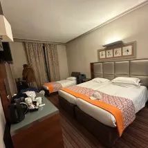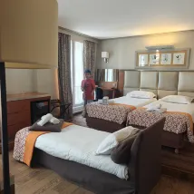 방은 꽤 넓습니다. 트리플룸에는 싱글 침대 2개와 소파 침대가 있어 매우 편리합니다. 짐 3개를 놓을 수 있습니다. 슬리퍼나 칫솔은 제공되지 않으므로 직접 가져와야 합니다. 호텔은 모스코 로드. 로마 지하철역은 매우 가까워서 3분 거리에 있지만, 자주 이용하는 생라자르 역과는 약간 떨어져 있어서 약 14분 거리에 있습니다. 위치가 이상적입니다. 14유로짜리 아침식사는 그럭저럭 먹을만한 음식이 많지는 않지만 배부르게 먹을 만큼은 됩니다.