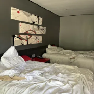 전반적으로 꽤 좋았습니다. 방은 모텔처럼 보였지만 비교적 상쾌했습니다. 방에 들어서자 방향제 냄새가 살짝 났지만 금방 사라졌습니다. 둥근 테이블과 의자가 따로 있었고, 욕실도 비교적 상쾌했습니다. 어제와 그제 묵었던 홀리데이 인과 힐튼 객실보다 훨씬 좋았습니다. 단점: 시트 사이에 머리카락이 여러 개 붙어 있어서 시트가 세탁되지 않은 것 같은 흔적이 있었는데, 정말 끔찍했습니다. 샴푸를 아주 조금만 짜내도 되지만, 컨디셔너는 전혀 나오지 않았습니다.