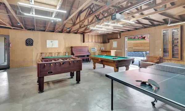 The living room is large with 75" Smart TV, electric fireplace and views. There is a garage converted game room with a bar, pool table, foosball table, poker table and dart board.