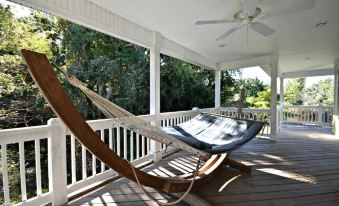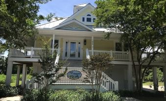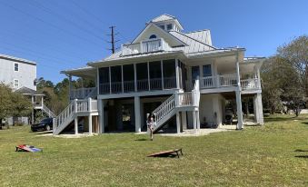 Four full bathrooms, marble. Four queen beds, and one king size bed. Granite Kitchen, Wireless Internet Access. Waterfront/lake front. Raised Beach House on acre lot. Three blocks to the ocean, Golf cart (seats 6!). Heart of pine wood floors. 42 inch plasma TV in living room, and TVs in every bedroom. Screen porch, front gate hammock, out door shower, outdoor games on hand inc. corn hole, badminton and croquette! Large circular drive.