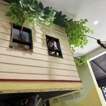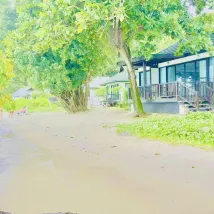 방 안 침대 발치 조심하세요⚠️ 부딪힐 수도 있으니 모기 퇴치제를 미리 준비하세요. 섬에는 모기가 많아요. 여기 놀이 공간까지는 따로 배를 타고 가야 하는데, 30분 정도 걸려요. 화장실 옆에는 더러운 야외 샤워실도 있어요🚿