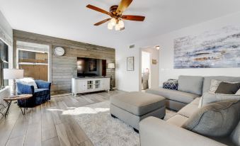 The living room is equipped with a large, flatscreen smart TV for cozy family movie nights and downtime. Of course, most of your time at home will be spent lounging in poolside splendor on the sun-filled, enclosed deck! Featuring expansive cabinetry and unique, "skylight" backsplash, the full kitchen is well-appointed and ready to handle family-style meals.