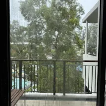 예약할 때 수영장 전망을 위해 추가 비용을 지불했지만, 결국 나무가 보이는 어두운 방을 받게 되었습니다.